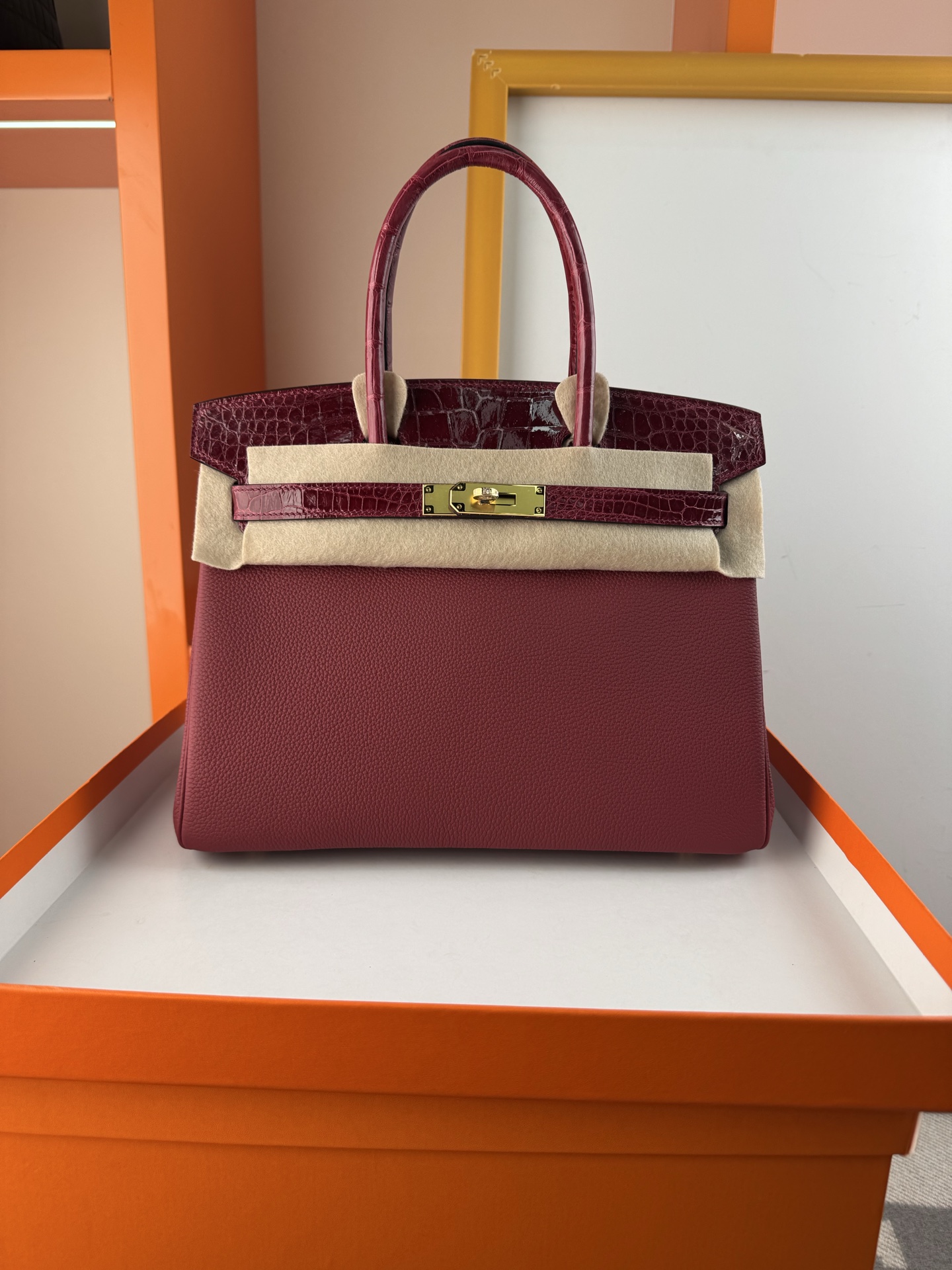 Birkin-30cm-touch-Togo-and-Shiny-Crocodile-Burgundy